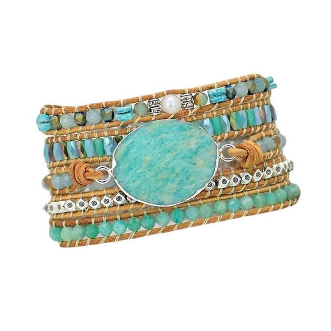 Bring calm, balance, and protection into your life with this beautiful 5-layer leather wrap bracelet. Handmade with natural Amazonite and a mix of gemstone beads, this bracelet measures approximately 32.5 inches (83 cm) and is adjustable through three closures to fit most wrists.