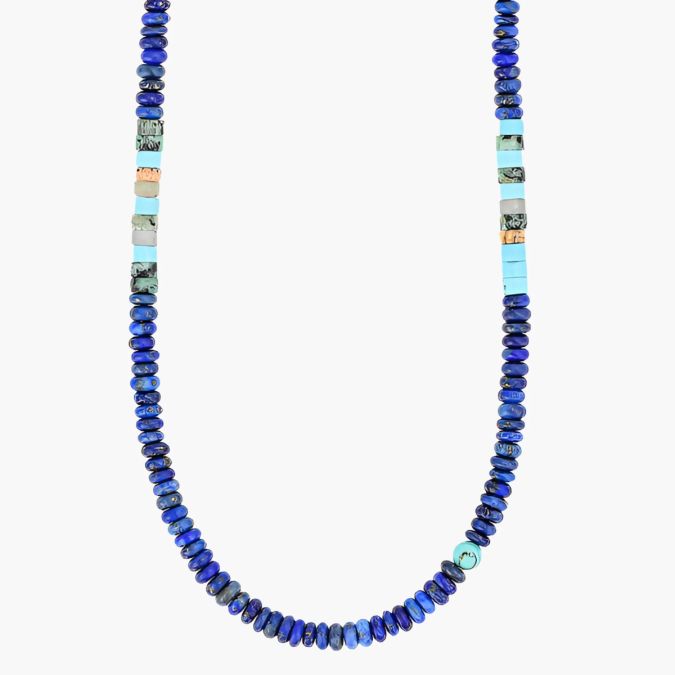 The Men's Deep Blue Horizon Necklace combines the celestial tones of Lapis Lazuli and vibrant turquoise, symbolizing strength, balance, and sophistication. This striking piece is perfect for the modern man, offering a blend of natural elegance and bold character, ideal for any occasion.
