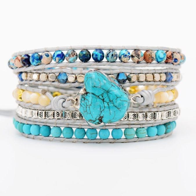 Embrace the vibrant energy of the ocean and earth with this stunning Turquoise Heart & Imperial Jasper 5-Wrap Bracelet. This intricate piece is meticulously handmade using a beautiful mix of natural stones and accent beads, designed to wrap five times around the wrist for a rich, multi-layered look.